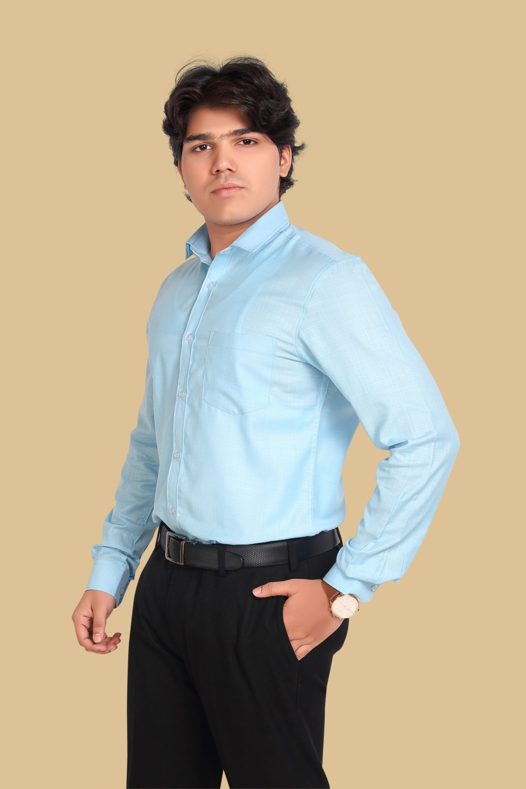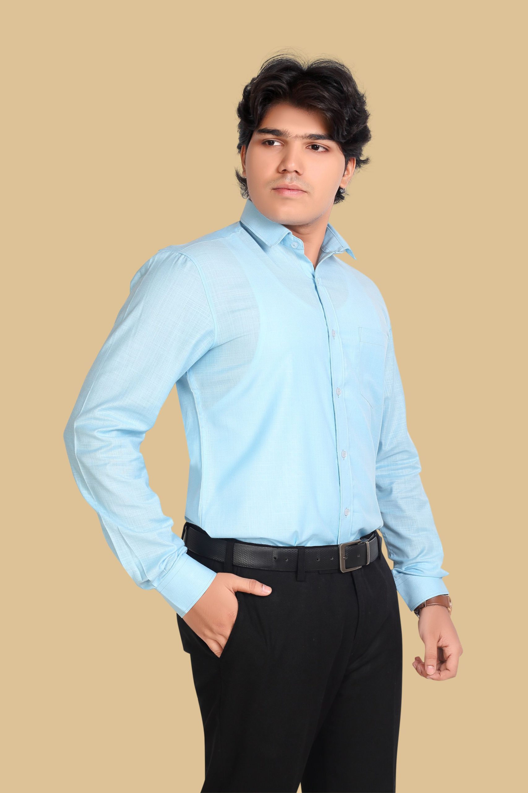 Make a crisp and calm impression with this Sky Blue Formal Shirt. Its refreshing tone, combined with a premium cotton-blend texture, ensures you stay cool, composed, and confidently dressed from morning to evening.